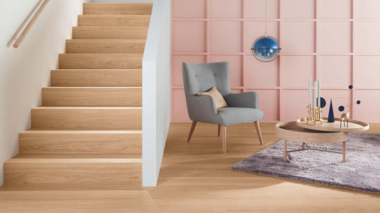 A standardpadlólapjainkkal való teljes kompatibilitást a 2-reteszelő beépítési rendszerbiztosítja, amely szoros, hézagmentes csatlakozást biztosít. A 90°-os sarkokminimalista kialakítása modern megjelenésű, elegáns átmenetet teremt a lépcsőés a padló között. Válassza ki a lépcsőél-megoldásnak megfelelő lépcsőél profilt(nyitott lépcső, ragasztás vagy úsztatott fektetés).